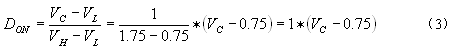 2. 占空比发生器DCG TPS54310内部采用电压模式的脉宽调制器,PWM比较器把误差放大器输出的控制电压与振荡器产生的锯齿波电压进行比较以产生所需的接通占空比DON,如(图4)所示。查TPS54310数据手册中的关键特性参数表可得, VL=0.75V,VH=1.75V,所以